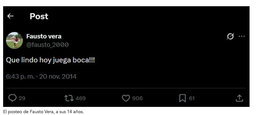 BUENOS AIRES (NA) — Se filtró un antiguo posteo del mediocampista Fausto Vera, quien tiene todo acordado para convertirse en nuevo refuerzo de River, en el que demuestra fanatismo por Boca.
